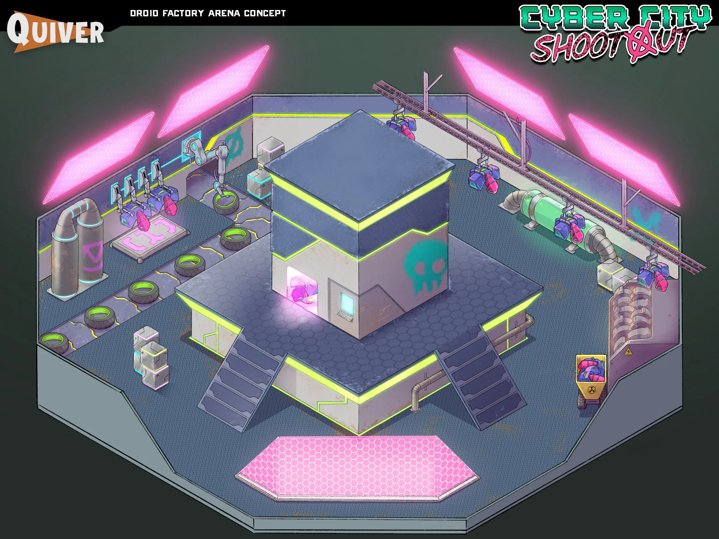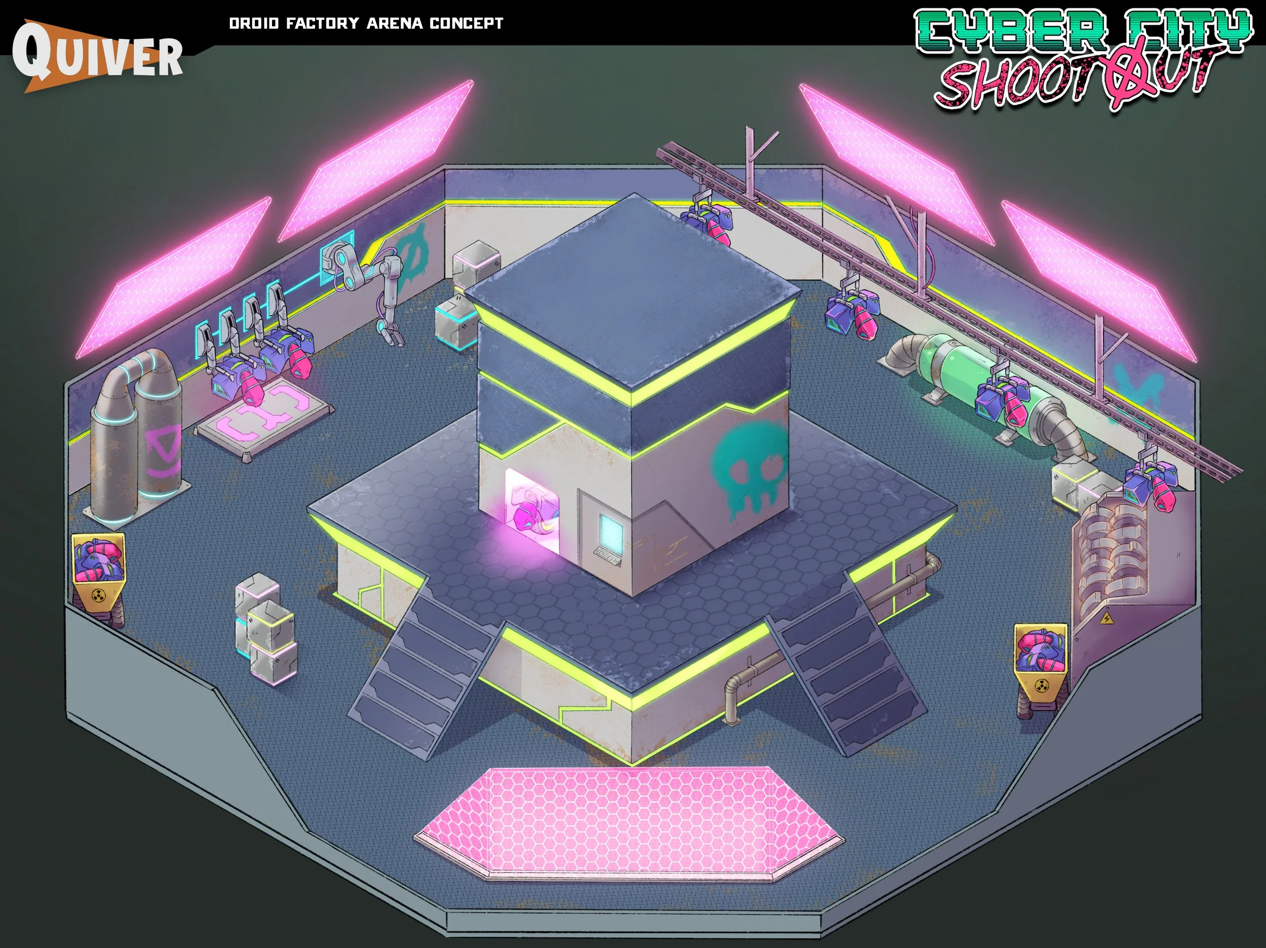 Environment concept art for the Droid Factory battle arena in Cyber City Shootout; a 3D first person shooter developed for Quiver’s comprehensive Godot 4 tutorial series.